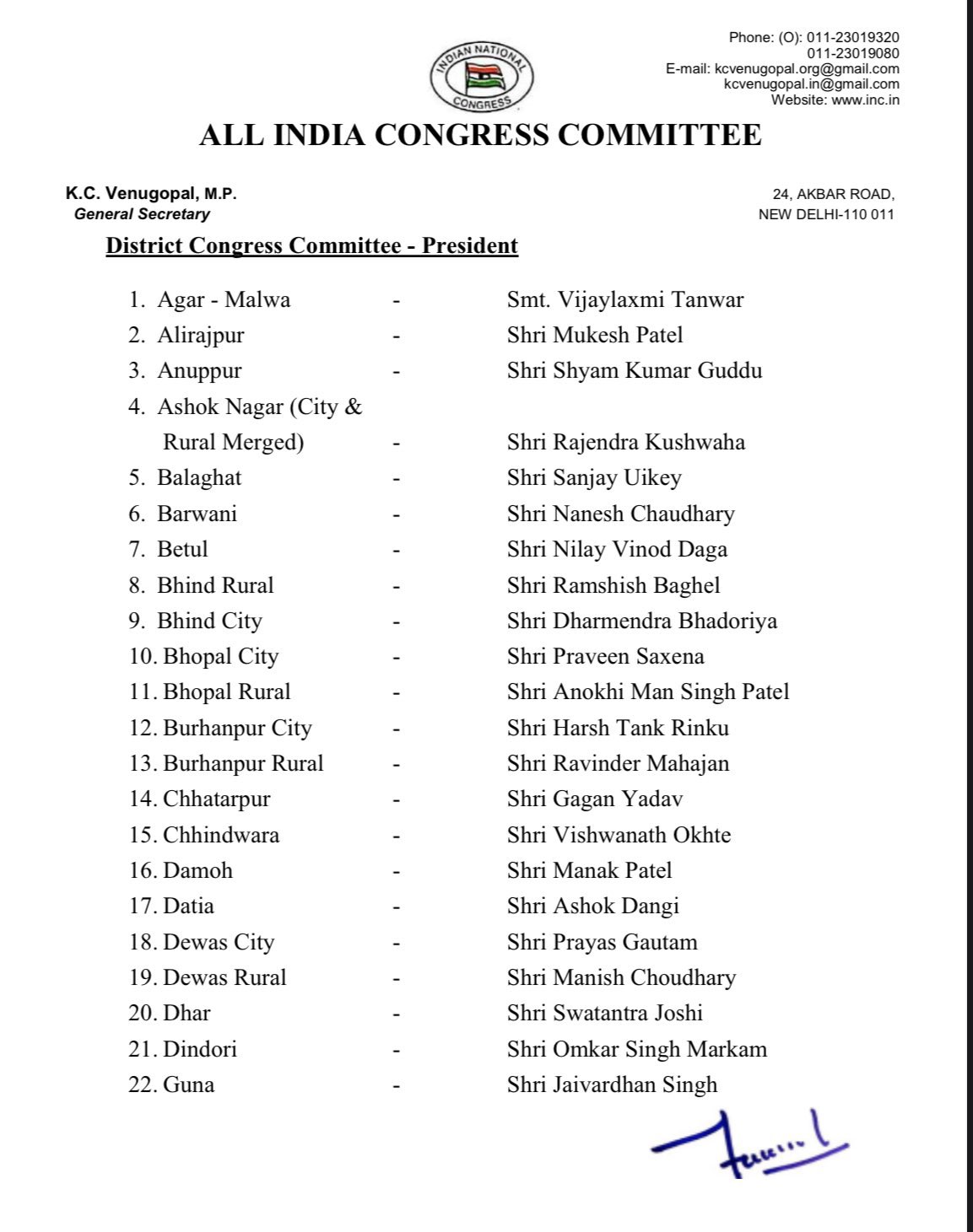 MP कांग्रेस ने जिला अध्यक्षों का किया ऐलान! 71 नामों पर मुहर, हरदा में मोहन विश्नोई को सौंपी गई कमान
